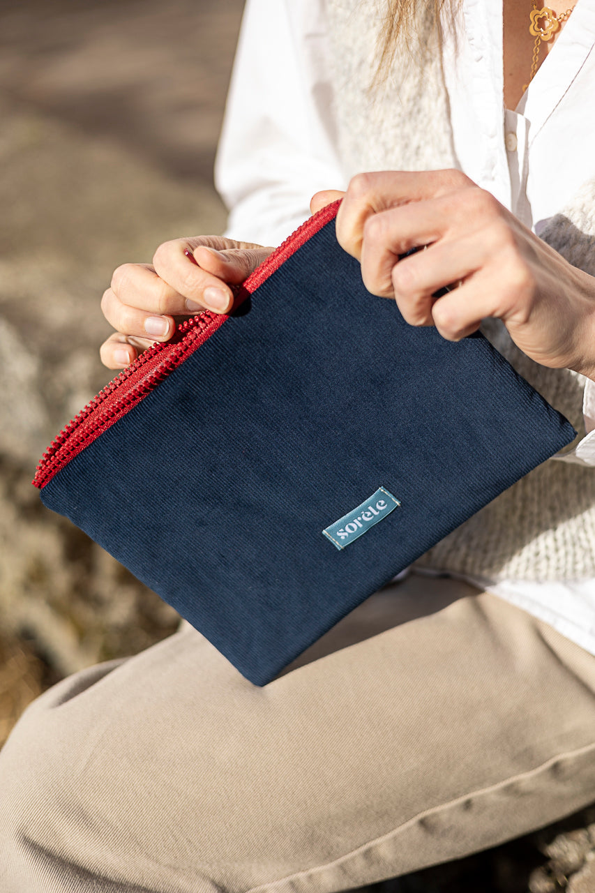Pochette piatta in morbido velluto di cotone; foderata internamente e con chiusura a zip. Piccola ma protettiva grazie all'imbottitura, è adatta ad essere trasportata ovunque. Può contenere make up e skincare, cancelleria, medicinali, dispositivi elettronici e tantissimo altro.